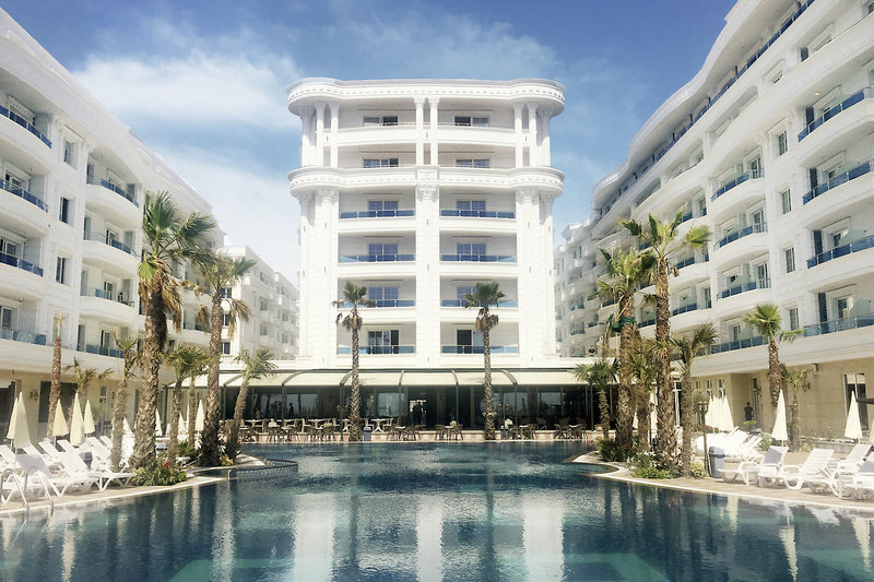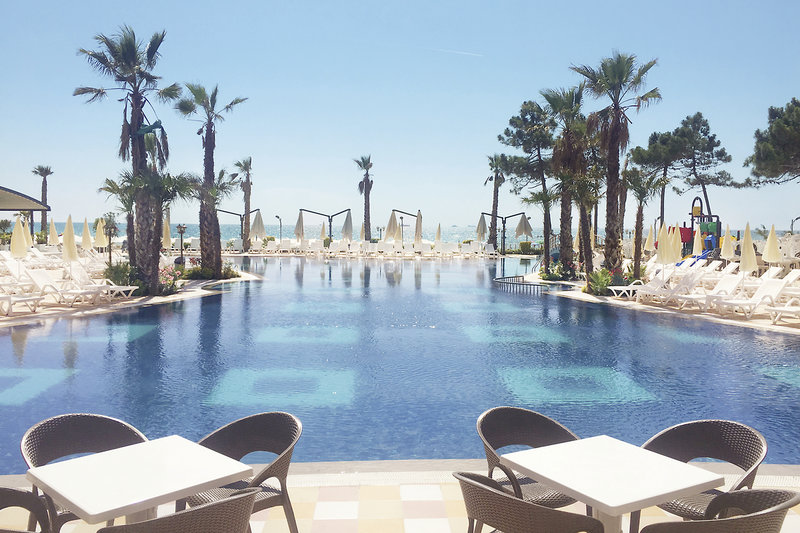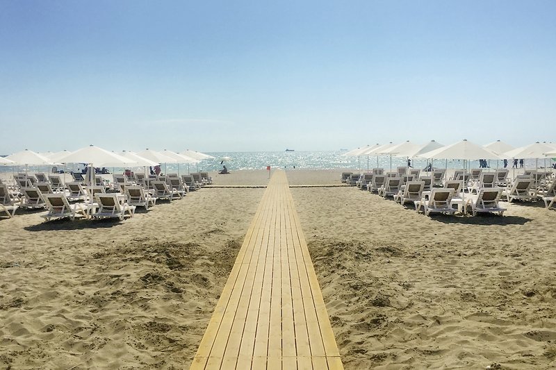 - Sandstrand: gehört zur Anlage, von der Anlage getrennt durch Promenade, Sonnenschirme, Liegen