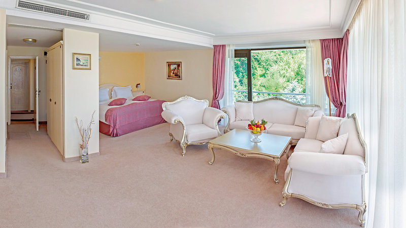 - 61-70 m², Dvojlôžková izba, Deluxe, Výhľad na park, Kombinovaná obývacia/spacia časť, pohovka, manželská posteľ, 1 kúpeľňa, vaňa, WC, sušič vlasov, koberec, klimatizácia, chodba, minibar (za poplatok), trezor (za poplatok), 1 TV (satelitná TV, nemecké kanály), Wi-Fi, rýchlovarná kanvica, káva/čaj, zariadený balkón, výmena posteľnej bielizne, výmena uterákov
