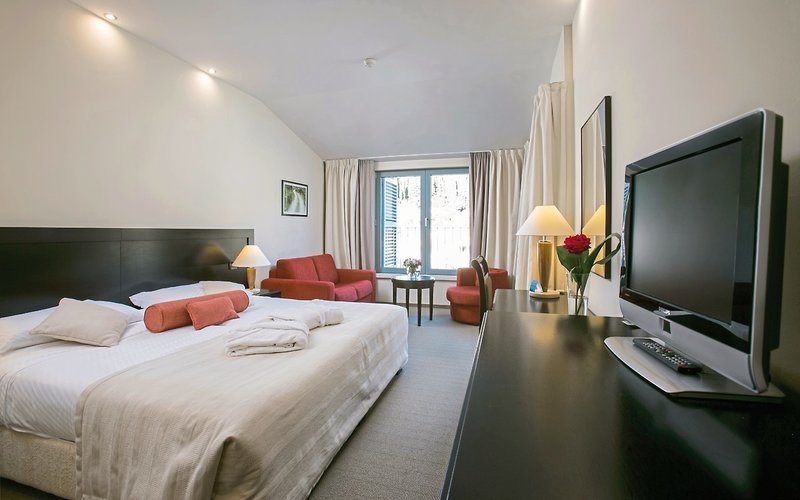 - 26-30 m2, dvojlôžková, výhľad na hory, posteľná bielizeň, uteráky a matrace zo 100% organickej bavlny, vaňa, župan, papuče, sušič vlasov, klimatizácia, minibar za poplatok, trezor, TV, balkón