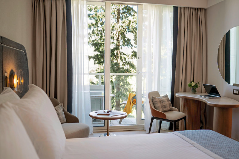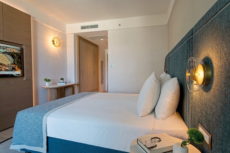 - Dvojlôžková izba, Deluxe, orientovaná na more, horné poschodie, výhľad na more, posteľná bielizeň, uteráky a matrace vyrobené zo 100 % organickej bavlny, vaňa, župan, papuče, fén, klimatizácia, minibar (za poplatok), trezor, TV, balkón, 24-hodinová izbová služba, ovocný košík, voda a pečivo pri príchode.