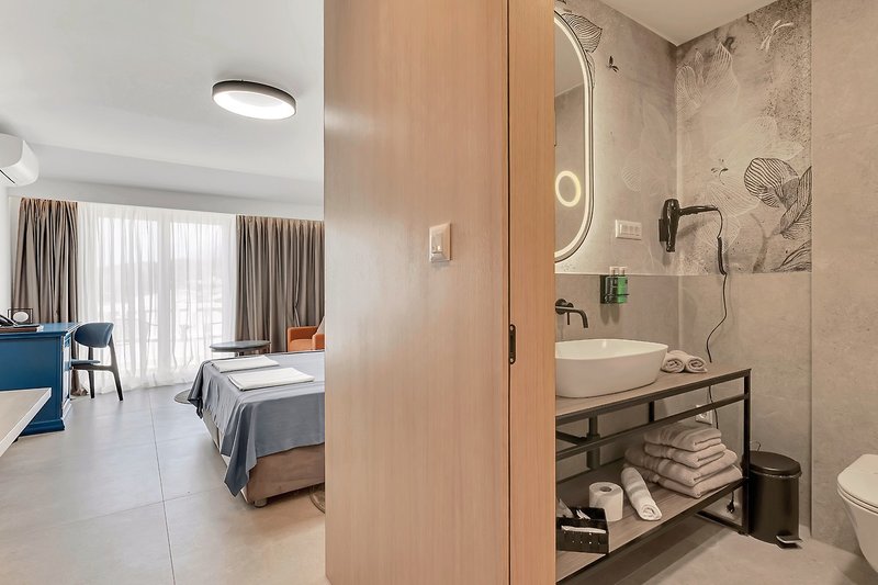 - 26-30 m2, dvojlôžková, premium, výhľad na more (bočný), zrekonštruovaná, sprcha na úrovni podlahy, sušič vlasov, klimatizácia, minibar za poplatok, trezor, TV, káva/čaj, balkón