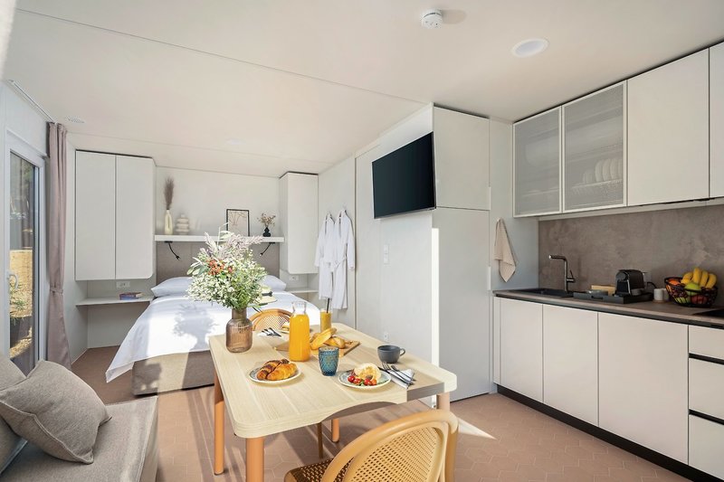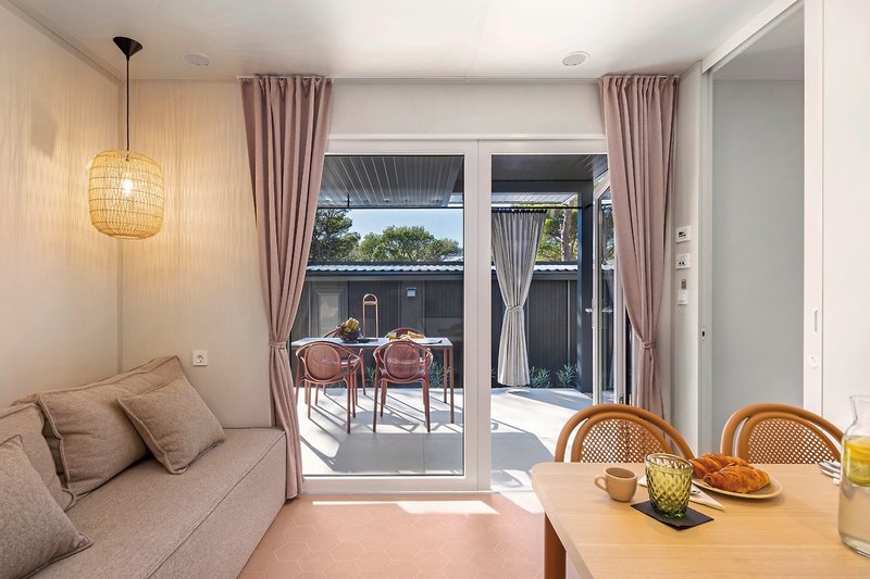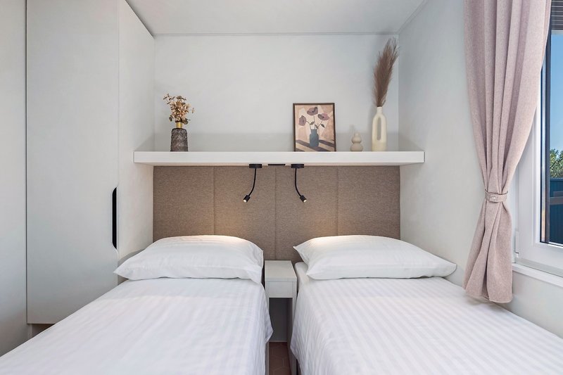 - 26-30 m², mobilný domček, 2 samostatné spálne, obývacia izba/spálňa, 2 samostatné postele, manželská posteľ, rozkladacia pohovka, 2 kúpeľne, sprchovací kút, WC, klimatizácia, trezor, TV, kuchynský kút, plynový/elektrický sporák (4 horáky), umývačka riadu, rýchlovarná kanvica, kávovar, chladnička, terasa 16-20 m² (zariadená), posteľná bielizeň zdarma, uteráky zdarma, záverečné upratovanie (už zahrnuté v celkovej cene)
