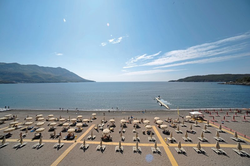 - Kiesstrand: Sonnenschirme, Liegen, Strandtuch/Badetuch