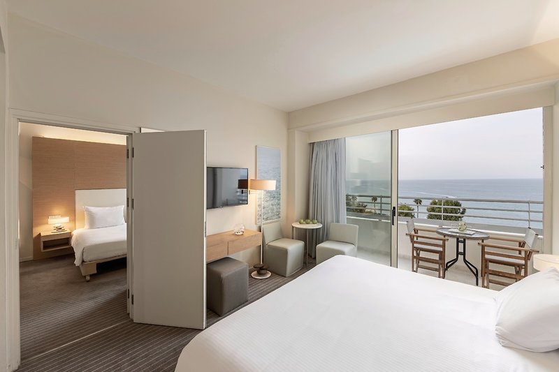 - 41-45 m2, rodiny, so spojovacími dverami, výhľad na more (bočný), 2 oddelené spálne, 2 samostatné postele, 1 manželská posteľ (king size), vaňa, WC, župan, papuče, sušič vlasov, klimatizácia, kúrenie, minibar za poplatok, trezor, TV, rýchlovarná kanvica, káva/čaj, balkón (zariadený)