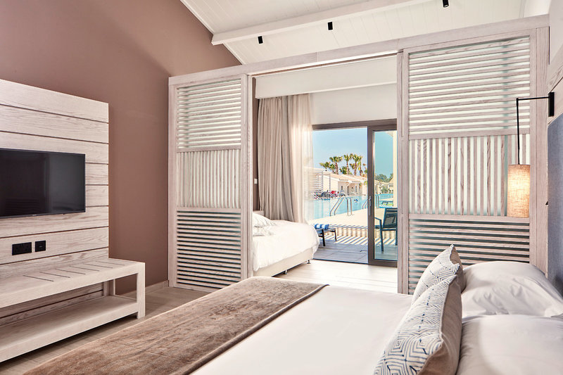 - 61-70 qm, Bungalow, Poolblick, 2 separate Schlafzimmer, separater Wohnraum, 2 Einzelbetten, 1 Doppelbett, Sofabett, Dusche oder Badewanne, WC, Bademantel, Badeslipper, Haartrockner, Klimaanlage, Mini-Kühlschrank, Safe, TV, Wasserkocher, Espressomaschine, Kaffee/Tee, Terrasse (möbliert), direkter Poolzugang, Gemeinschaftspool