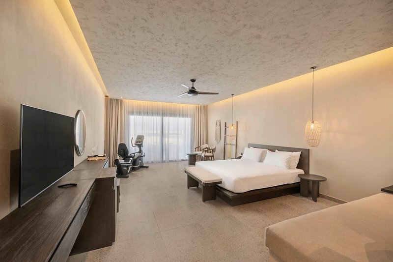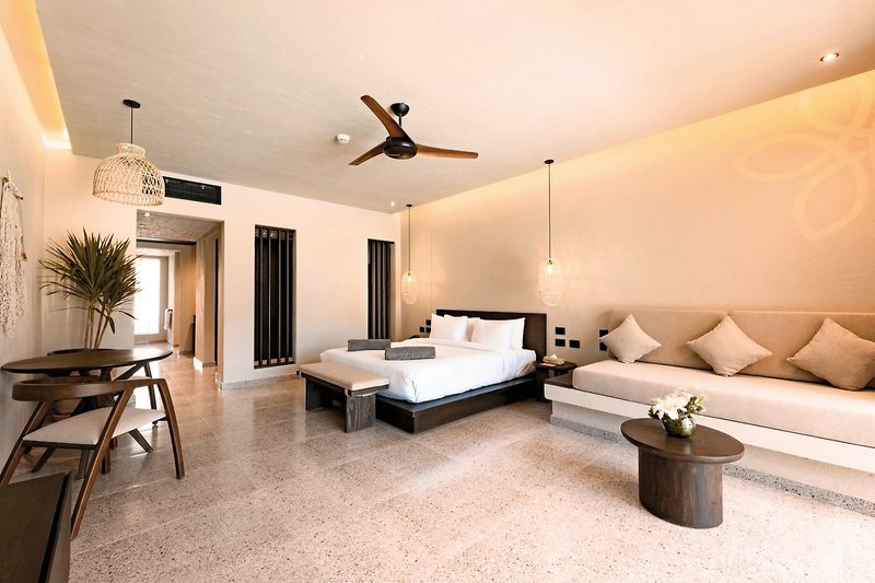- 51-60 qm, Juniorsuite, Strandlage, Meerblick (zum Teil seitlich), Doppelbetten (1 Kingsize oder 1 Twin), Dusche oder Badewanne, Haartrockner, Kosmetikspiegel, Klimaanlage, Minibar kostenpflichtig, Safe, TV, Kaffee/Tee, Terrasse (möbliert), direkter Poolzugang, Gemeinschaftspool