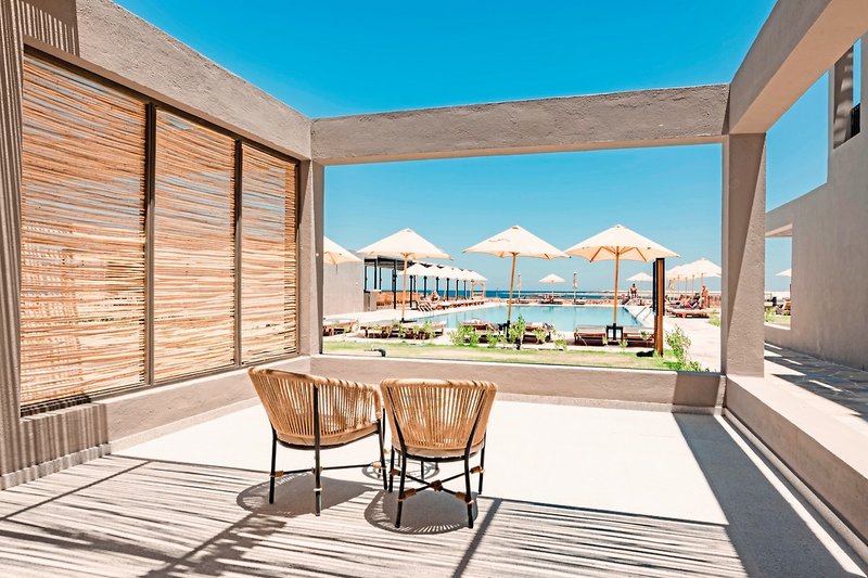 - 51-60 qm, Juniorsuite, Meerblick (zum Teil seitlich), Doppelbett, Dusche oder Badewanne, Haartrockner, Kosmetikspiegel, Klimaanlage, Minibar kostenpflichtig, Safe, TV, Kaffee/Tee, Terrasse (möbliert), direkter Poolzugang, Gemeinschaftspool