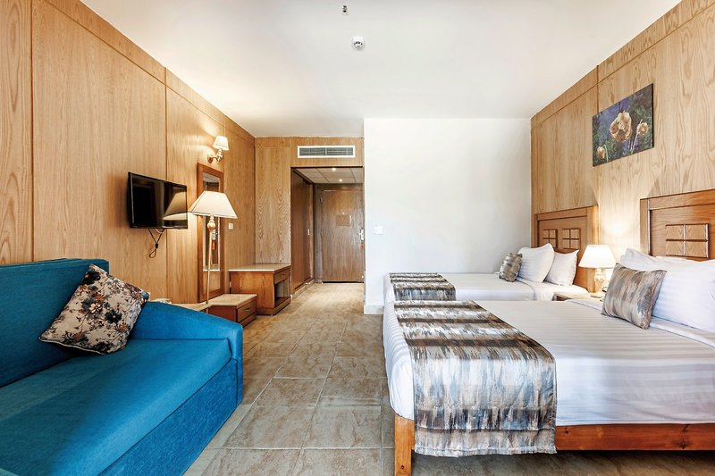 - 46-50 m², Rodinná izba, Superior, Výhľad do záhrady, 2 samostatné spálne, 2 jednolôžka, manželská posteľ, sprcha, fén, klimatizácia, minibar, dopĺňanie pri príchode, nealkoholické nápoje, voda, trezor, TV, káva/čaj, terasa (zariadená)