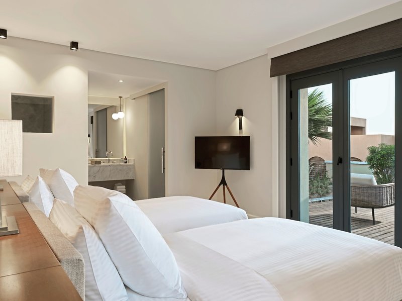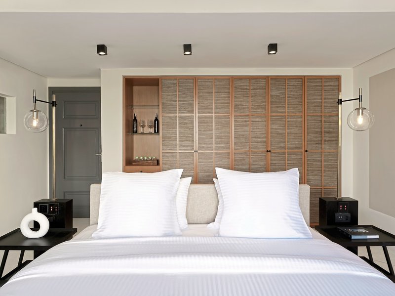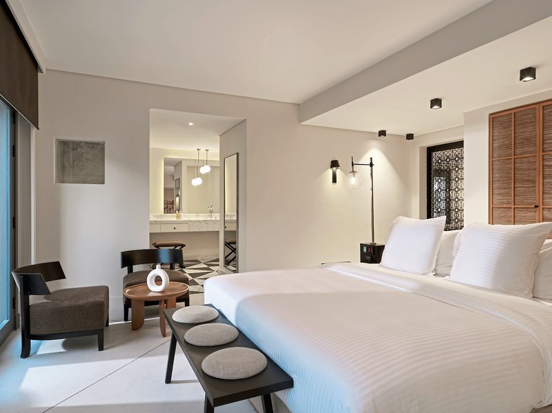 Izby: 82 izieb a apartmánov je zariadených v neutrálnych zemitých tónoch a jednoduché ebenové rámy podčiarkujú sofistikovanú minimalistickú atmosféru. S posteľou king alebo 2 oddelenými posteľami, východnou estetickou kúpeľňou s mramorovým umývadlom a dažďovou sprchou, županom, sušičom vlasov, telefónom, TV, WiFi (bez poplatku), príslušenstvom na prípravu kávy/čaju, trezorom, minibarom (za poplatok), Smart Digital Room Management a klimatizácia.