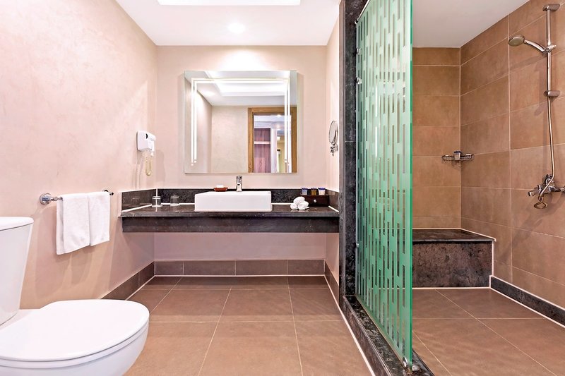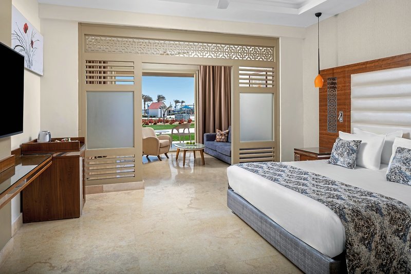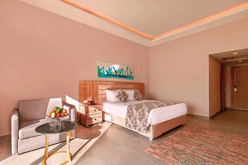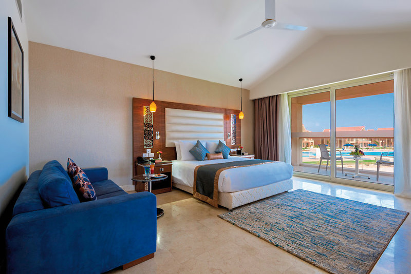 - 51-60 m², junior suita, výhľad na bazén, samostatná obývacia izba, sprchovací kút, fén, kozmetické zrkadlo, dlažba, klimatizácia, minibar (pravidelne dopĺňaný), trezor, TV, balkón alebo terasa (zariadená)
