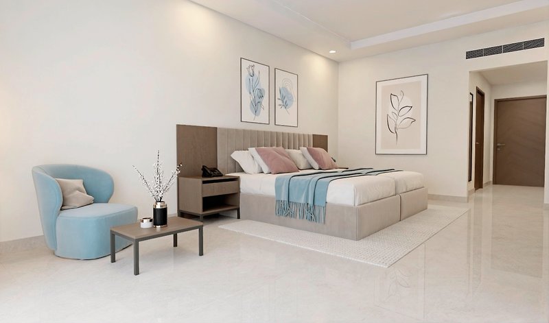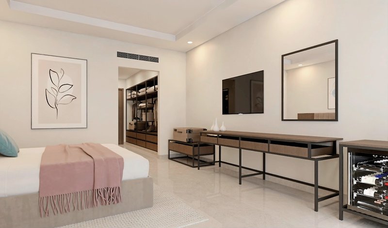 - 61-70 m², Suita, Deluxe, Novostavba, Výhľad na bazén, 2 izby (opticky oddelené), 2 samostatné postele, manželská posteľ (king-size), sprcha, fén, kozmetické zrkadlo, klimatizácia, minibar (pravidelne dopĺňaný), trezor, TV, balkón alebo terasa (zariadená)