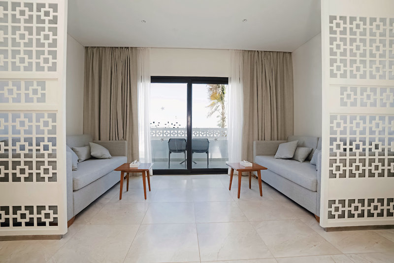 - 51-60 qm, Familien, Gartenblick, Poolblick oder seitl. Meerblick, 2 separate Schlafzimmer, 2 Einzelbetten, Doppelbett (Kingsize), Sofabett, 2 Bäder, bodengleiche Dusche, Bidet, Haartrockner, Kosmetikspiegel, Fliesen, Klimaanlage, Minibar, Safe, TV (Smart-TV), Wasserkocher, Kaffee/Tee, Balkon oder Terrasse (möbliert), bei Ankunft im Zimmer Wasser