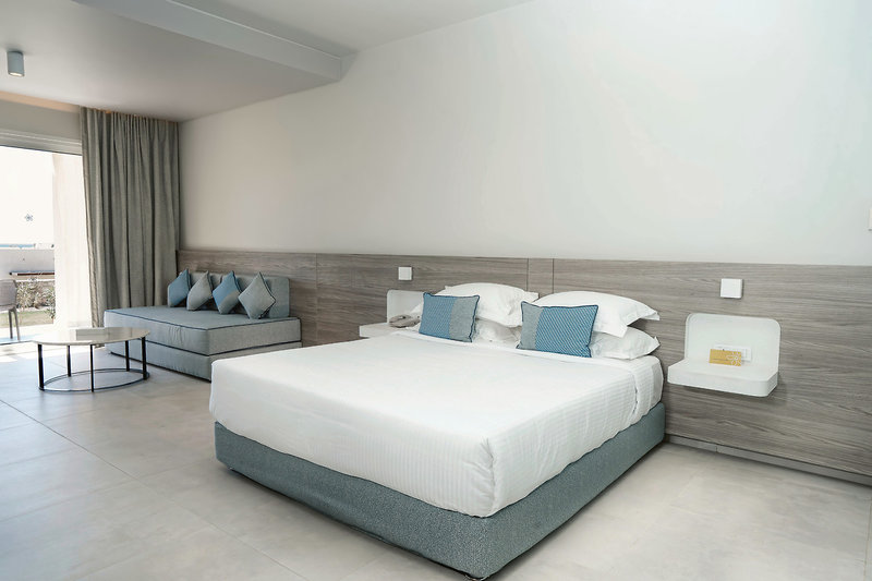 - 46-50 qm, Doppel, Komfort, Gartenblick, Poolblick oder seitl. Meerblick, Sitzecke, Doppelbett (Kingsize), 2 Sofabetten, bodengleiche Dusche, Bidet, Haartrockner, Kosmetikspiegel, Fliesen, Klimaanlage, Minibar, Safe, TV (Smart-TV), Wasserkocher, Kaffee/Tee, Balkon oder Terrasse (möbliert), bei Ankunft im Zimmer Wasser