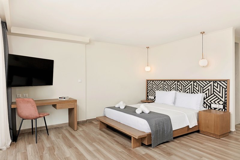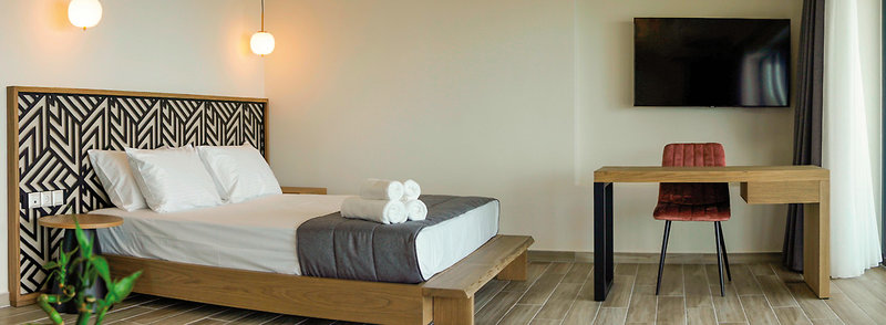 - 36-40 qm, Juniorsuite, Meerblick, kombinierter Wohn-/Schlafraum, Doppelbett (Queensize), 1 Bad, Dusche, WC, Haartrockner, Klimaanlage, Minibar kostenpflichtig, Safe, 1 TV (Flachbildschirm, Smart-TV), Balkon oder Terrasse (möbliert), hochwertige Badartikel