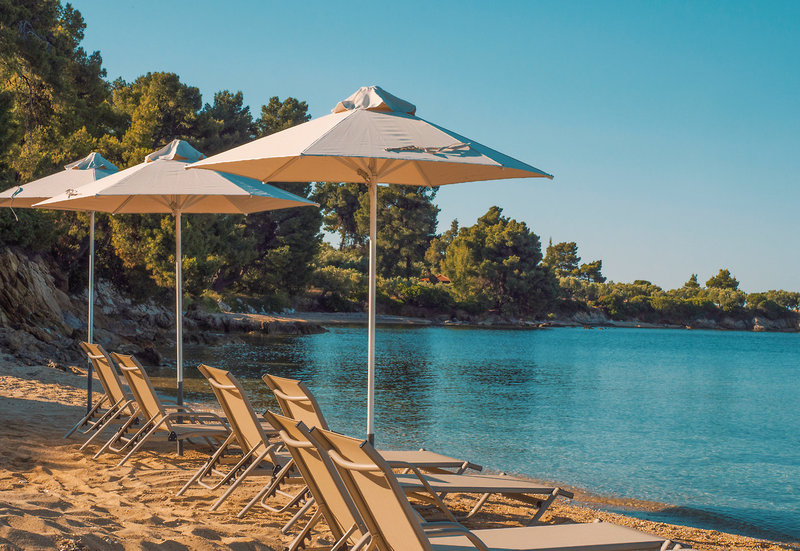 - Sandstrand: Sonnenschirme, Liegen