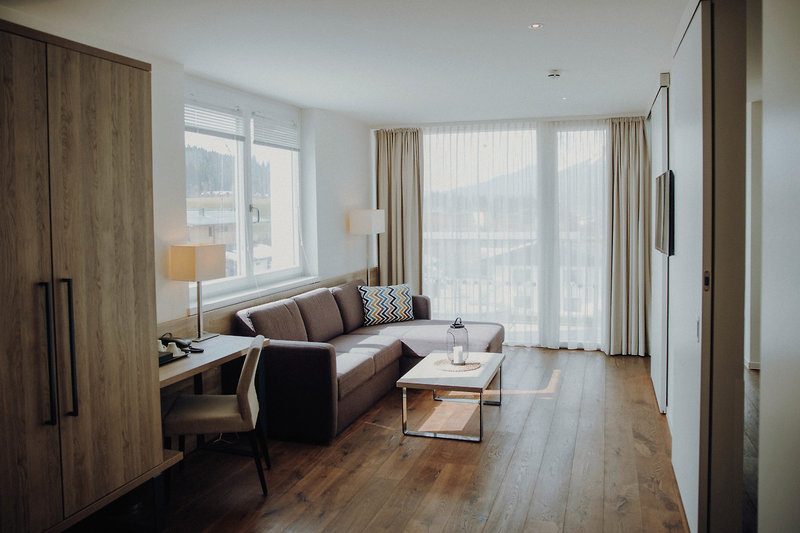 - 41-45 qm, Juniorsuite, Executive, Neubau, Etage, 4., 5., Bergblick, separates Schlafzimmer, separater Wohnraum, Schreibtisch, Couch, Boxspringbett, Badewanne, Regendusche, Bademantel, Haartrockner, Parkett, Minibar, Safe, TV, Kaffeemaschine, Balkon