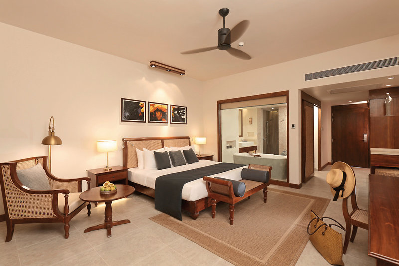 Die Zimmer: 120 Zimmer und 32 Villen. Mit Bad, separater Regendusche, freistehender Badewanne, Bademantel, Föhn, Telefon, TV, DVD-Player (auf Anfrage), WLAN, Minibar, Safe, Kaffee-/Teezubereiter, Ventilator und Klimaanlage, Wein-Humidor. Jeweils mit großzügiger möblierter Terrasse oder Balkon mit Garten- oder Meerblick.