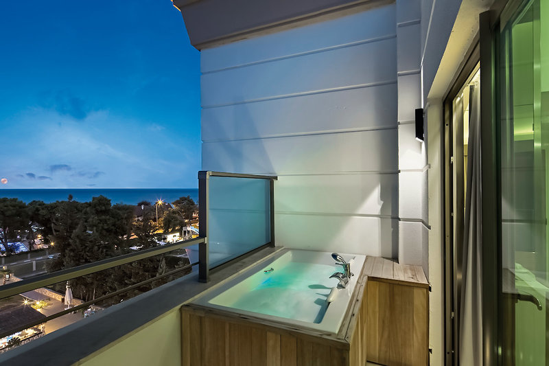 - 21-25 m2, apartmán, výhľad na more, manželská posteľ, 1 kúpeľňa, sprcha, WC, papuče, fén, klimatizácia, minibar, pravidelne dopĺňaný, nealko nápoje, minerálna voda, voda, trezor, TV (satelitná TV), rýchlovarná kanvica , káva/čaj, Terasa (zariadená), vírivka