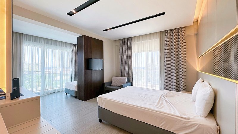 - 36-40 m2, rodiny, jednolôžko, manželská posteľ, sprcha, WC, fén, laminátové podlahy, klimatizácia, individuálne nastaviteľné, minibar, voda, trezor, TV (satelitná TV), rýchlovarná kanvica, káva/čaj, balkón