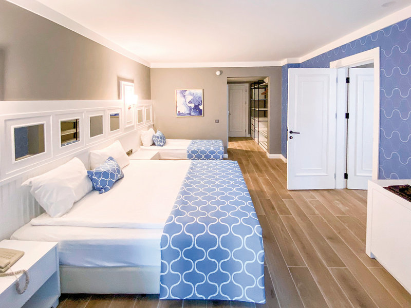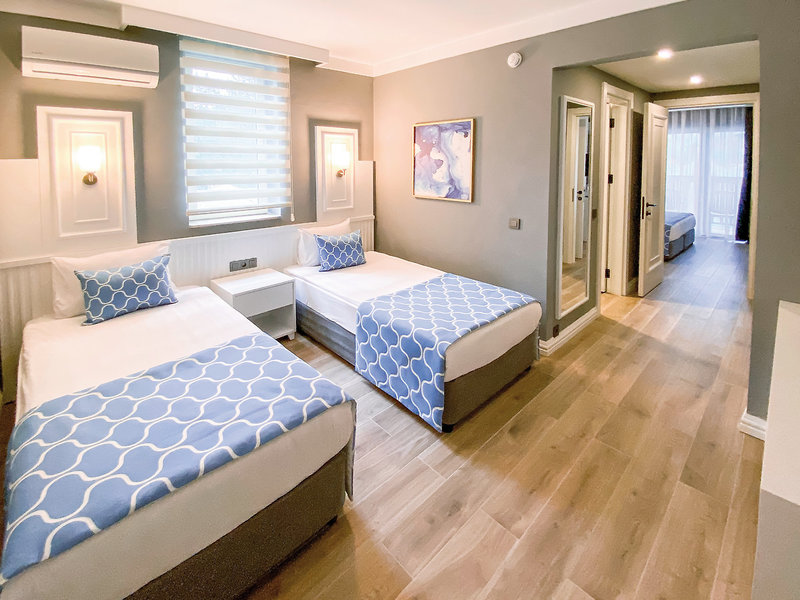 - 36-40 m2, rodinný, so spojovacími dverami, výhľad do záhrady, 2 oddelené spálne, 2 jednolôžka, manželská posteľ, 1 kúpeľňa, sprcha, WC, župan, papuče, sušič vlasov, klimatizácia, individuálne nastaviteľný, minibar, dopĺňaný pri príchode, nealko nápoje, minerálna voda, džúsy, voda, trezor, 2 TV (satelitná TV), rýchlovarná kanvica, káva/čaj, balkón